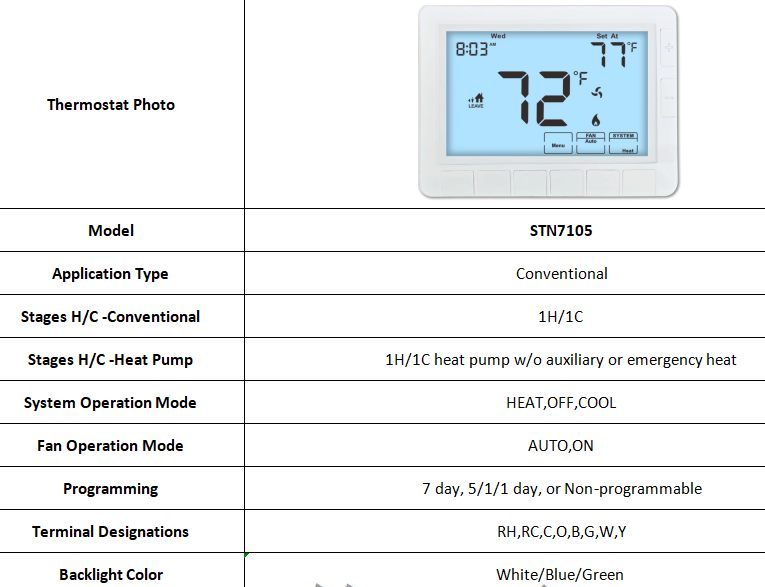 De STN7105 fungeert als een veelzijdige digitale thermostaatcontroller, compatibel met conventionele verwarmings- en koelsystemen.Het ondersteunt een warmtepompconfiguratie van 1H/1C zonder hulp- of noodverwarming, waardoor het een efficiënte motor thermostaat optie voor verschillende HVAC installaties.