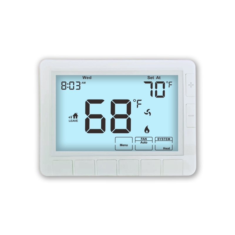 Deze veelzijdige thermostaat ondersteunt meerdere systeemoperatiemodi, waaronder HEAT, OFF en COOL, waardoor het geschikt is voor conventionele HVAC-systemen.Y een naadloze integratie met een breed scala aan verwarmings- en koelapparatuur mogelijk makenDe achtergrondverlichtingskleuren van wit, blauw en groen verbeteren de zichtbaarheid en de gebruikersinteractie, vooral in zwak verlichte omgevingen, waardoor het gebruik te allen tijde gemakkelijk is.
