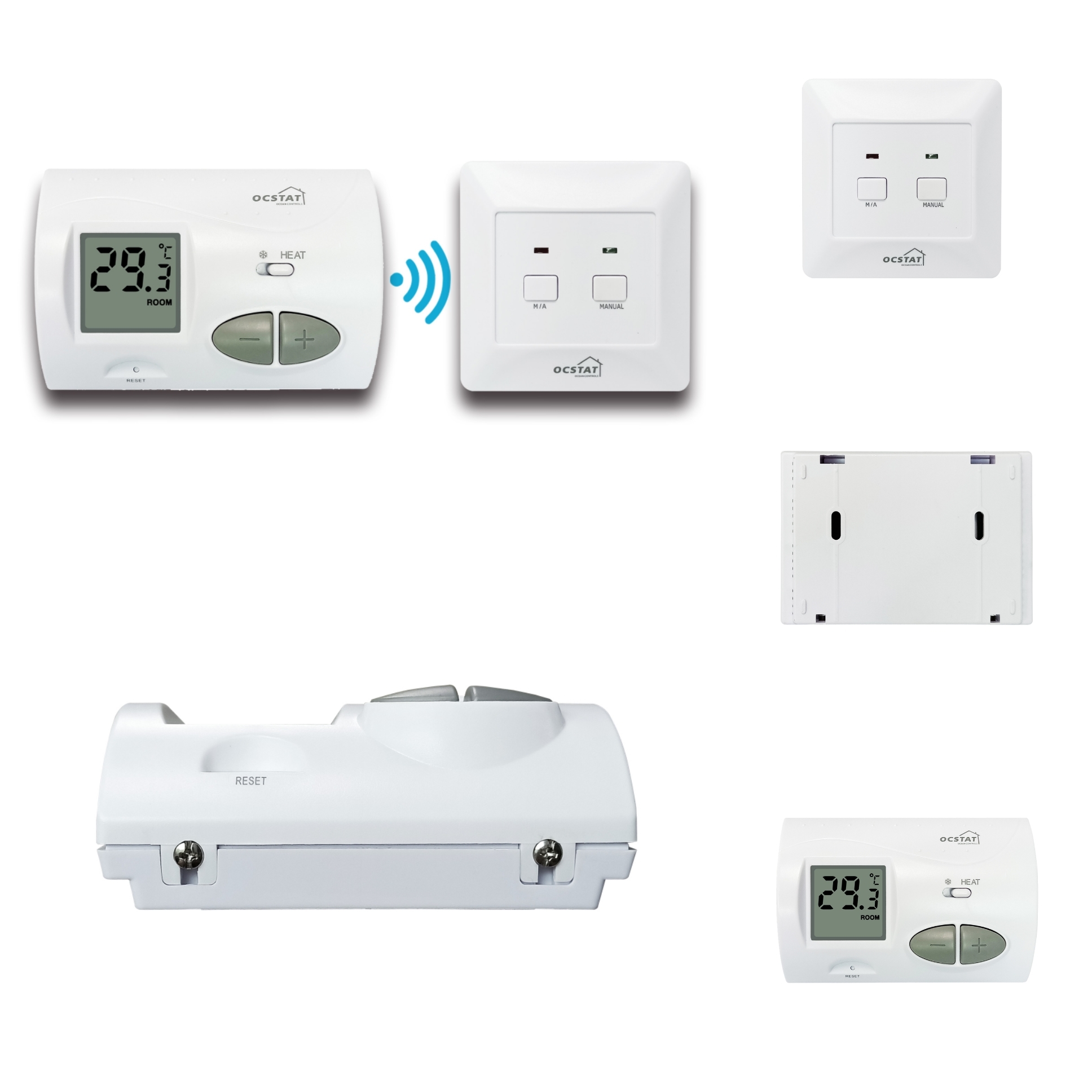 De OCSTAT Draadloze Kamerthermostaat, model C3RF, is een geavanceerde elektronische kamerthermostaat die is ontworpen om een nauwkeurige temperatuurregeling in verschillende omgevingen te bieden. Dit product, afkomstig uit Guangdong, China, combineert betrouwbaarheid met moderne technologie, waardoor het een ideale keuze is voor zowel residentiële als commerciële toepassingen. Gecertificeerd met CE-, FCC- en ISO-normen, garandeert de OCSTAT C3RF veiligheid en kwaliteit en voldoet hij aan internationale eisen voor digitale kamerthermostaten.